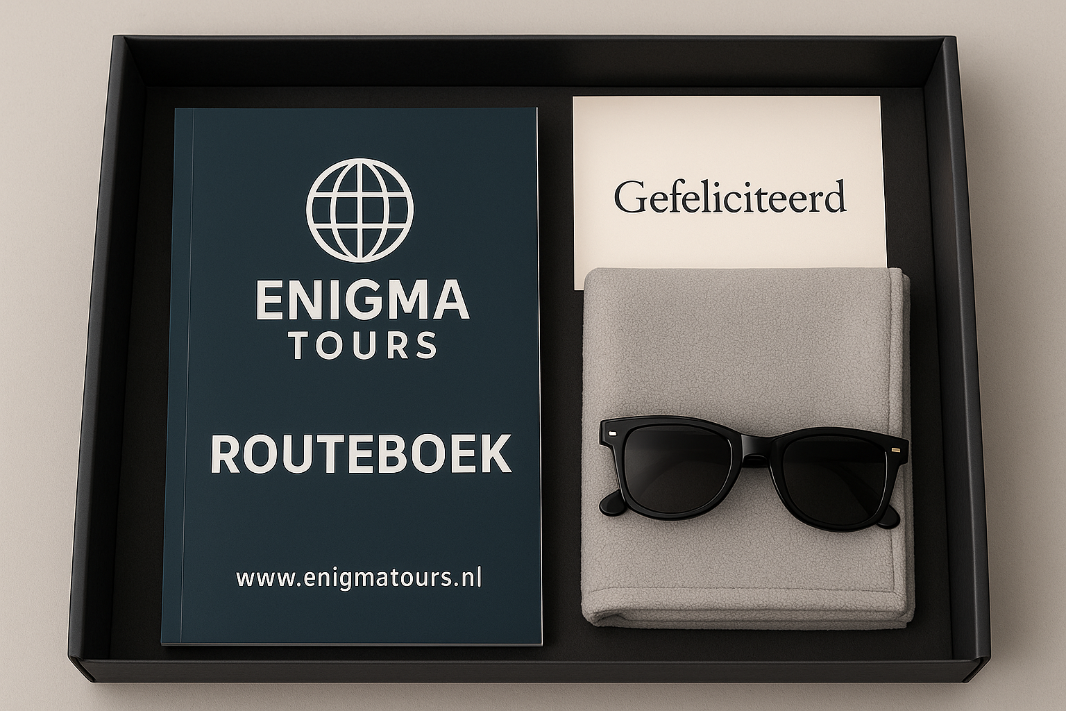 - Jij bestelt de Enigma-Tourbox voor je team, klanten of relaties. Kies het aantal, voeg jullie eigen boodschap of branding toe en wij zetten alles in gang.